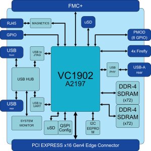 The PCIe form factor is suitable for desktop, lab, rack mount and data center deployments in commercial temperature ranges. Additionally, the board can optionally be deployed stand-alone without any reliance on a host CPU. The FMC+ interface on the board allows off-chip support of the many standard and custom interfaces that can be supported by the Versal ACAP through the very wide range of Alpha Data and 3rd Party FMC IO adapters available. Flexible reference designs, allowing customers to access the full IO flexibility of the chip are provided for both the Vivado and Vitis tool chains.