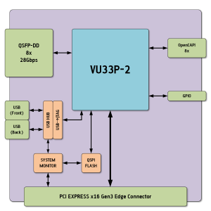 The ADM-PCIE-9H3 utilises the Xilinx Virtex Ultrascale Plus FPGA family that includes on substrate High Bandwidth Memory (HBM Gen2). This provides exceptional memory Read/Write performance while reducing the overall power consumption of the board by negating the need for external SDRAM devices. There are also a number of high speed interface options available including 100G Ethernet MACs and OpenCAPI connectivity, to make the most of these interfaces the ADM-PCIE-9H3 is fitted with a QSFP-DD Cage (8x28Gbps lanes) and one OpenCAPI interface for ultra low latency communications.