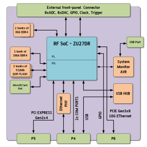 The ADM-XRC-9R1 is a high performance System On Module (SOM) based on the Xilinx Zynq Ultrascale+ RFSoC, which combines FPGA Fabric, ADC and DAC interfaces and ARM CPU cores in a single low-power device.
