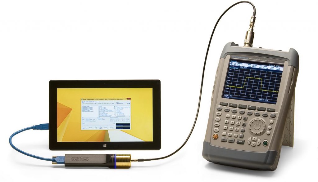 A tablet drives the DTU-315. The RF output signal is shown on a spectrum analyzer.