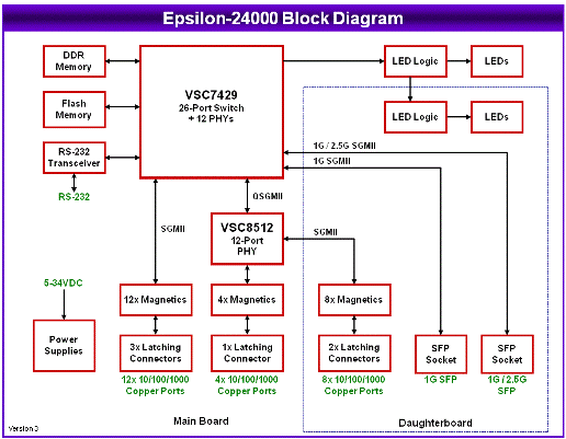 Two Development Kits are available for the Epsilon-24000. The DK-EPS24026 Development Kit contains an EPS-24026-104 26-port Gigabit Ethernet switch, cable kit and LED accessory board. The DK-EPS24016 Development Kit contains an EPS-24016-104 16-port Gigabit Ethernet switch, cable kit and LED accessory board.