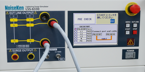 <LSS-6330>: Simplifies start-up inspection works only by connecting dedicated cables to the tester to confirm whether or not the output is present. (pre-checking). (Available for SURGE OUTPUT/EUT LINE OUTPUT)