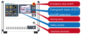 | Emergency stop | Push-lock(Test STOP, High voltage OFF, EUT switch SHUT OFF) | ||