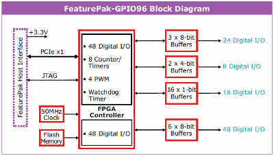 The built-in FPGA personality provides multiple configuration options. All 96 I/O lines may be used in common I/O mode; Six of these ports can be reconfigured to enable an array of additional features, including 8 32-bit up/down counter/timers with programmable input source and gate, 4 24-bit PWM circuits with 0-100% duty cycle capability and interrupt/latched mode operation.