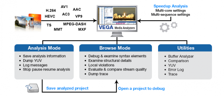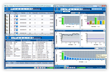 VEGA decodes each and every video frame to provide deep insight into the compressed stream; from high-level structural information down to individual bits in a macro block. Analysis is presented for stream, sequence and access unit levels and includes key attributes in a graphical manner to help encoder developers browse through the statistical information of the stream.