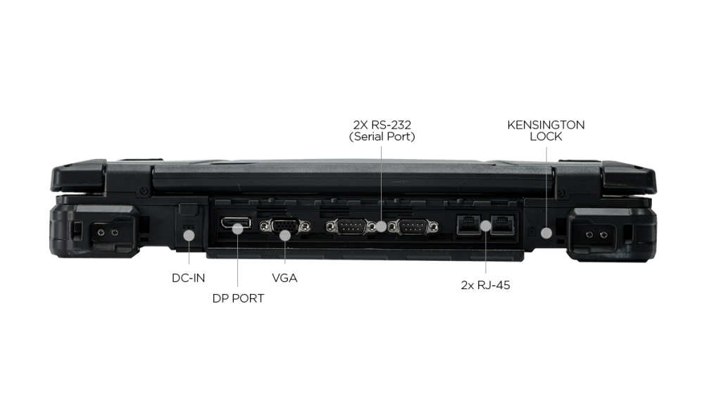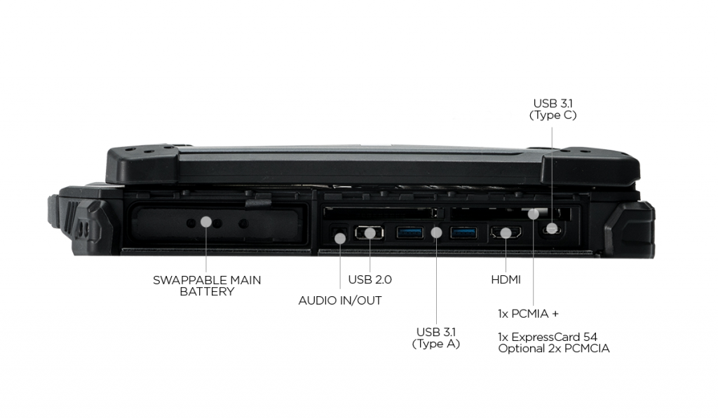 | I/O Ports | USB 3.1 (type A) x 2 USB 3.1 (type C) x 1 USB 2.0 (type A) x 1 Audio in/out (combo jack) x 1 microSD card (microSDXC) x 1 10/100/1000 Ethernet (RJ-45) x 2 VGA port (D-sub,15-pin) x 1 DP port x 1 HDMI port (type A) x 1 Serial port (RS-232 : D-sub, 9-pin) x 2 Docking connector (41-pin Pogo) x 1 SIM card x 1 Smart card reader x 1 DC-In jack x 1 PCMCIA Type II x1 ExpressCard 54 x1 or PCMCIA Type II x1 Optional RF antenna pass-through for GPS, WWAN, and WLAN |