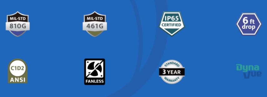 | Display | 14.0” FHD (1920 x1080) 1000 nits DynaVue® sunlight readable display with capacitive multi-touch screen User selectable touch mode for Finger/Water, Glove, or Stylus programmable function |